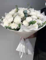 Букет из белых хризантем сорта Алтай с благородным эвкалиптом.